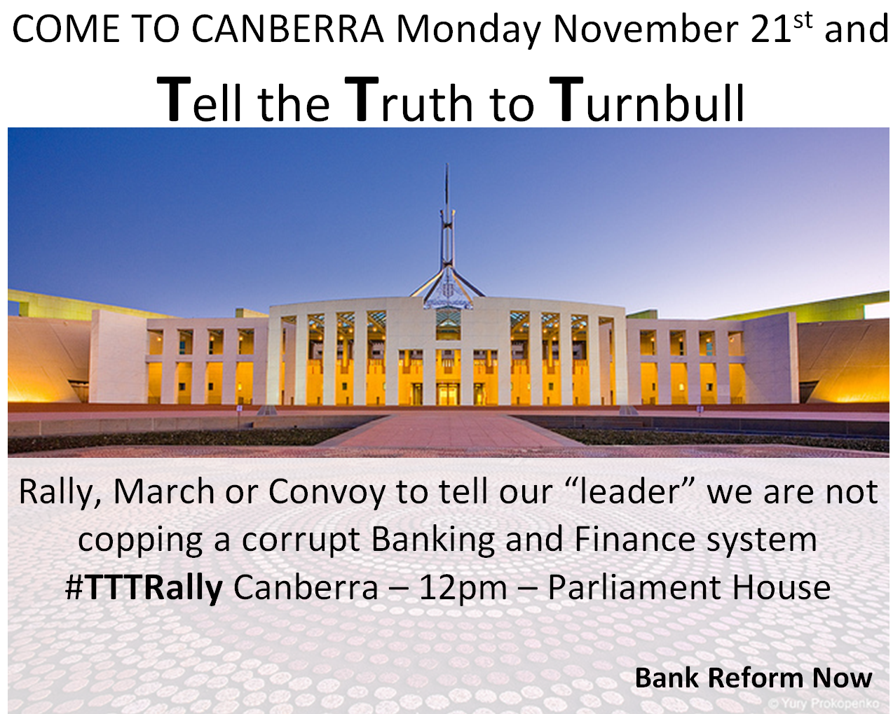 Decades of government backing of a criminal banking system has forced people to take action. Bank Reform Now spearheads the Tell the Truth to Turnbull Rally.