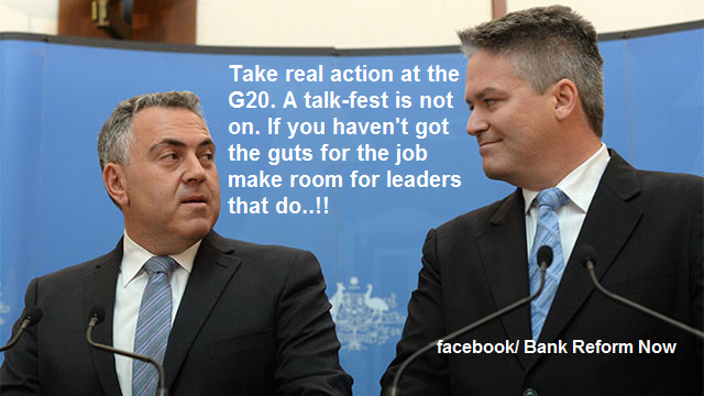 The G20 meeting in 2014 is a great opportunity to have critically important issues sorted out to help avoid further global financial turmoil. Will world leaders rise to the occasion - or will they continue to protect corporate criminals?