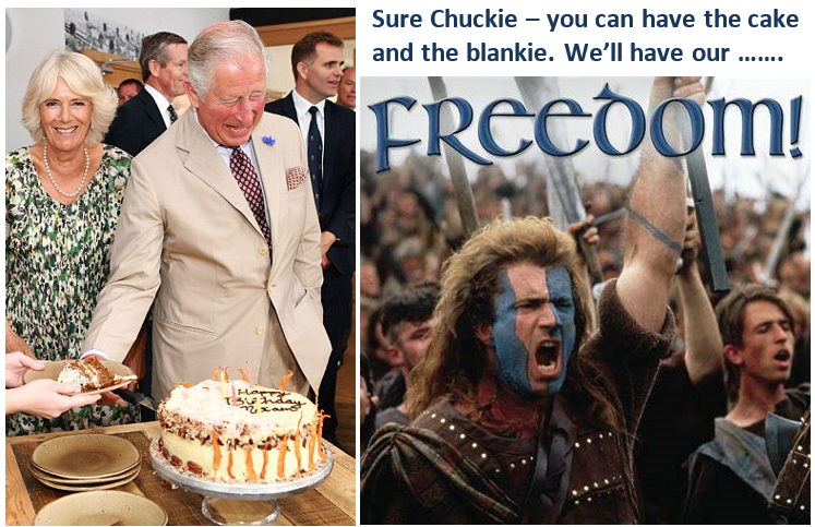 Maybe one day when Charles is touring Scotland and he has his bed and other essentials trucked up at public expense there might be some sort of a slip up. He might be feeling sad and cold because his favourite cashmere blanket was left behind. Perhaps it’s a freezing cold Scottish night. There might be some people protesting because they can’t afford the gas or electricity to heat their homes. Charles blurts out – “Every stinking time .......... Let them burn wood!” – while he’s eating his favourite cake.