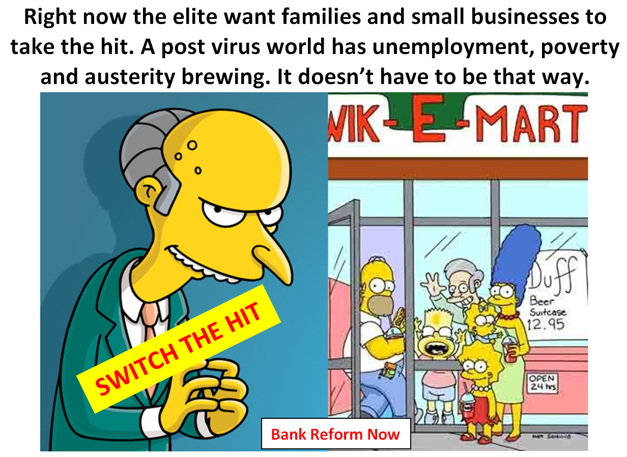 The COVID-19 virus crisis brings a great opportunity for long overdue reforms that will transform and improve the lives of every Australian. BUT it all depends on whether our government puts the interests of the elite ahead of our interests. Right now the government is looking at Aussie families and small businesses taking a hit. Bank Reform Now says ...... SWITCH THE HIT..!!